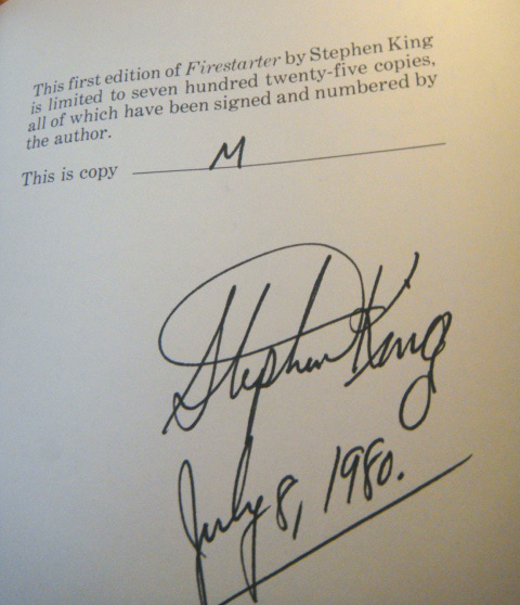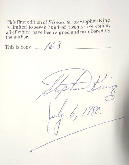 - Limited edition of 725 slipcased copies. Dustjacket artwork by Michael Whelan. Signed and numbered by Stephen King. The limitation sheet reads: "This first edition of Firestarter by Stephen King is limited to 725 copies, all of which have been signed an numbered by the author. This copy _____________". Below this is Stephen King's signature and date. The issue price for this book was $35, now $3,000-$4,000