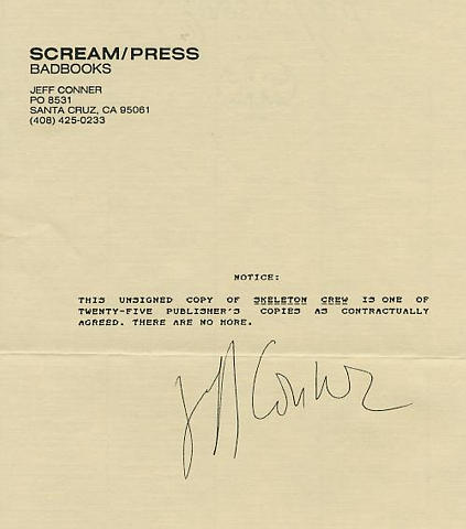 • There were also 25 unsigned PC copies of the limited edition book, The overruns are the same as the limited edition, except they are not signed or numbered. For a picture of the official letter from Scream Press about this click here Also the black slipcase may or may not have the Skeleton Picture pasted to it (depending on the book) I own two PC copies, one has the picture on the slipcase, the other does not....$400-$600 (est)